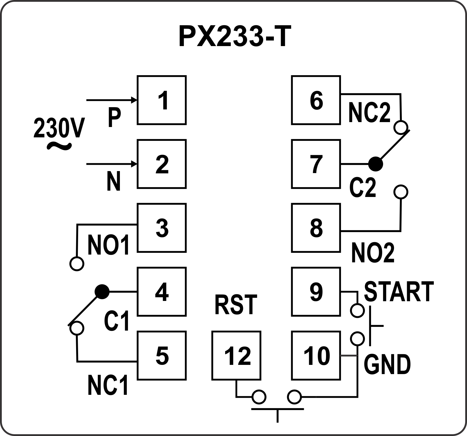 | Input Type | For Timer: Start Input: Pulse Type: Remote (Potential Free) Front (Configurable) Gate Type: Remote (Potential Free) For Counter: Counting Input: NPN/PNP type Input from proximity sensor/Contact Switch/Encoder Reset Input:Remote (Potential Free) Front (Configurable) On Power Interruption (Configurable) |