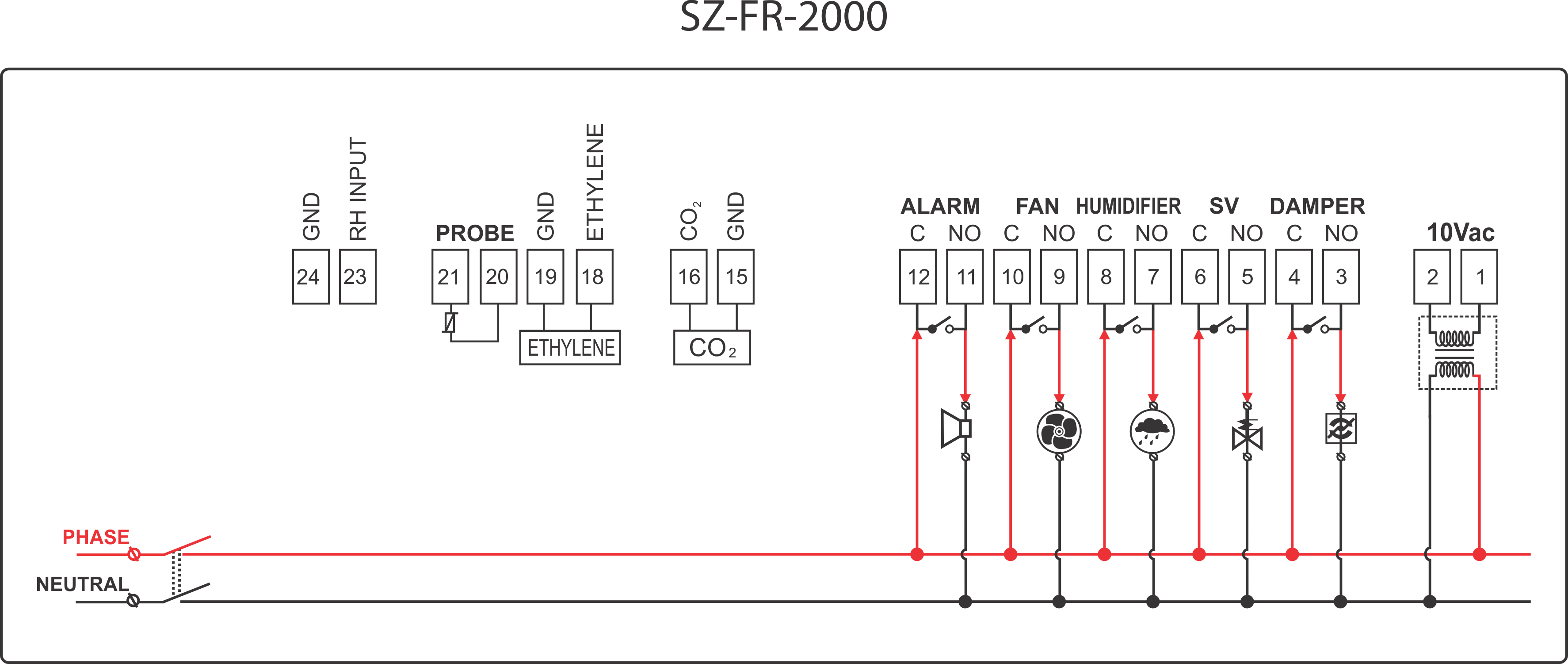 | Relay Outputs | Fan : 8(3)A Humidifier : 10A SV : 10A Alarm : 5A Damper : 10A |