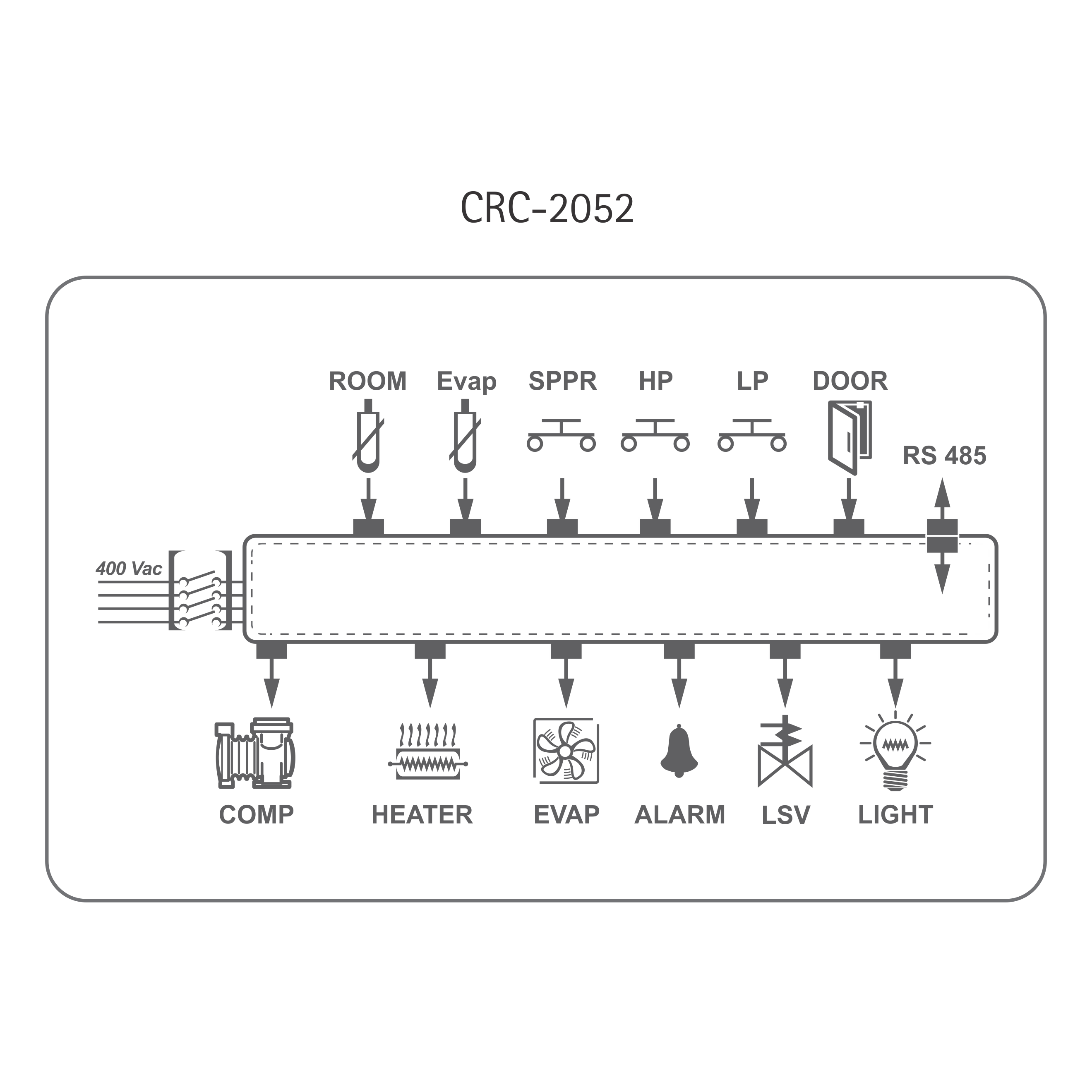 | Relay Output | Compressor Contactor : 3 Pole + 1 Aux, 400 V, 18A (230Vac Coil) Defrost Contactor : 3 Pole + 1 Aux, 400 V, 18A (230Vac Coil) Evaporator Fan Contactor : 3 Pole + 1 Aux, 400 V, 9A (230Vac Coil) Condenser : 8(2)A LSV : 8(2)A Light : 5A Alarm : 5A |