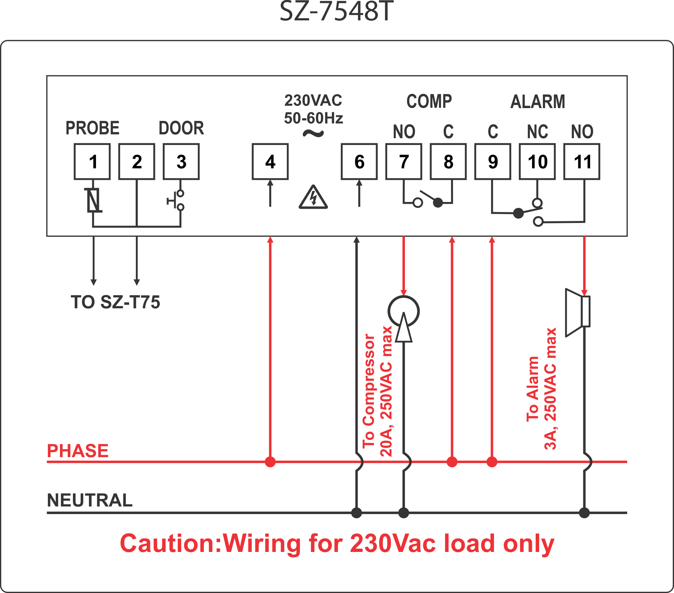 | Relay Outputs | Compressor : 20(8)A Alarm : 3A |