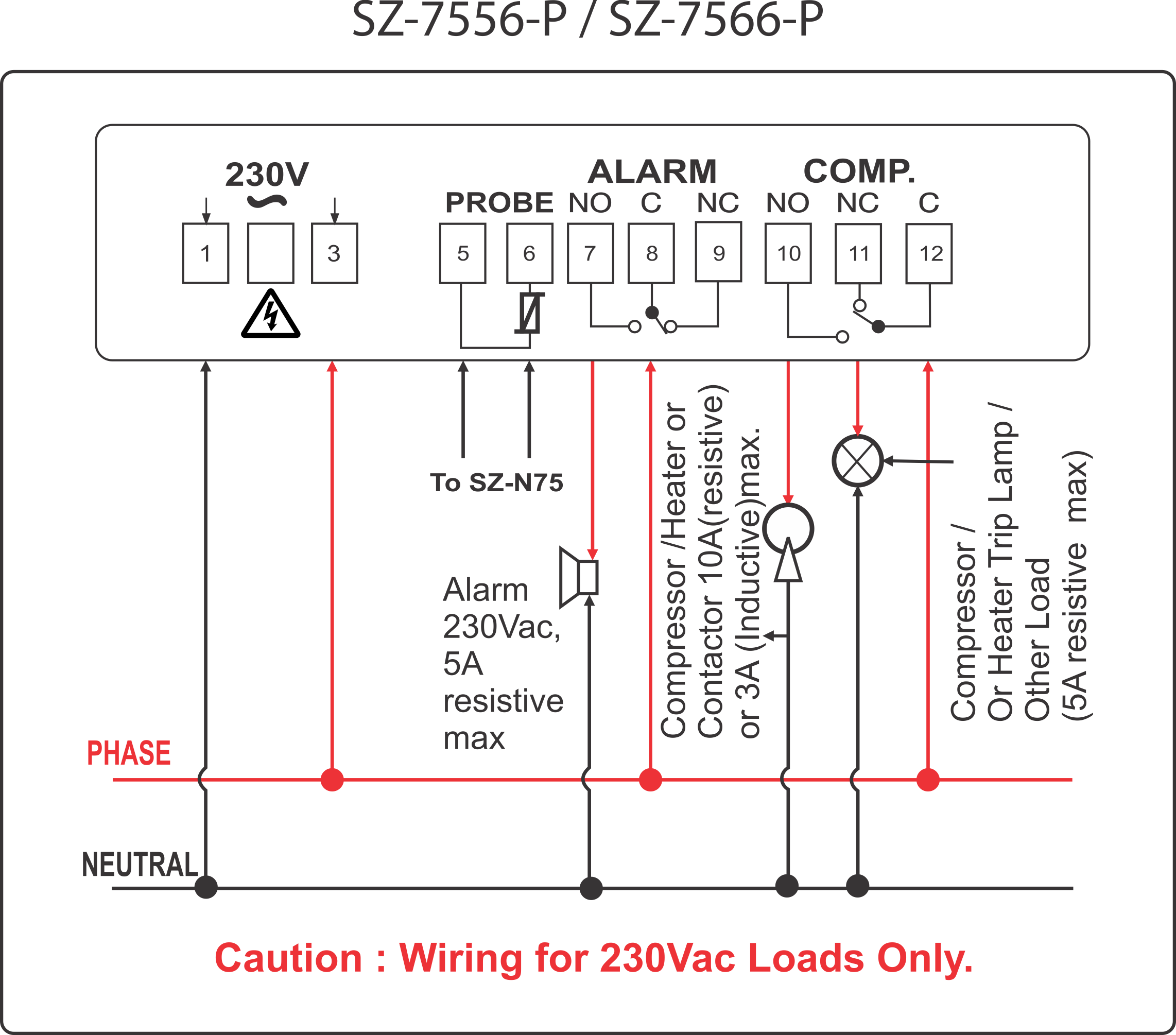 | Relay Outputs | Compressor : 8(3)A Alarm : 5A |