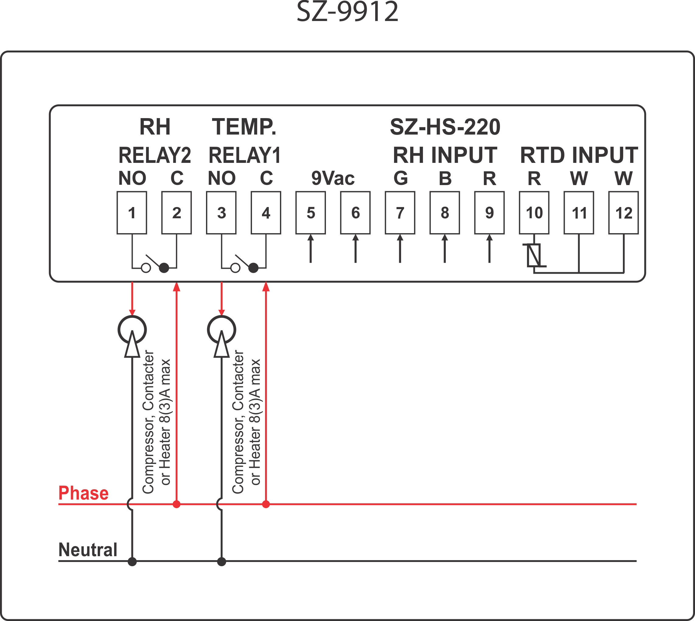 | Relay Outputs | Compressor : 8(3)A Humidifier / Dehumidifier : 8(3)A |